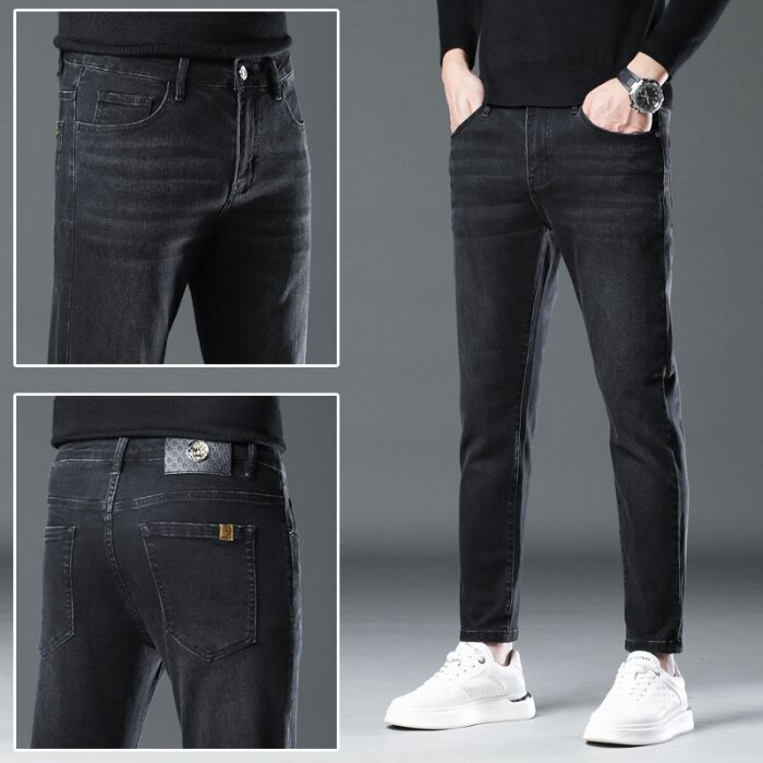 High-end black trendy cropped jeans men’s 2023 autumn and winter New slim fit skinny pants men’s all-match long pants
