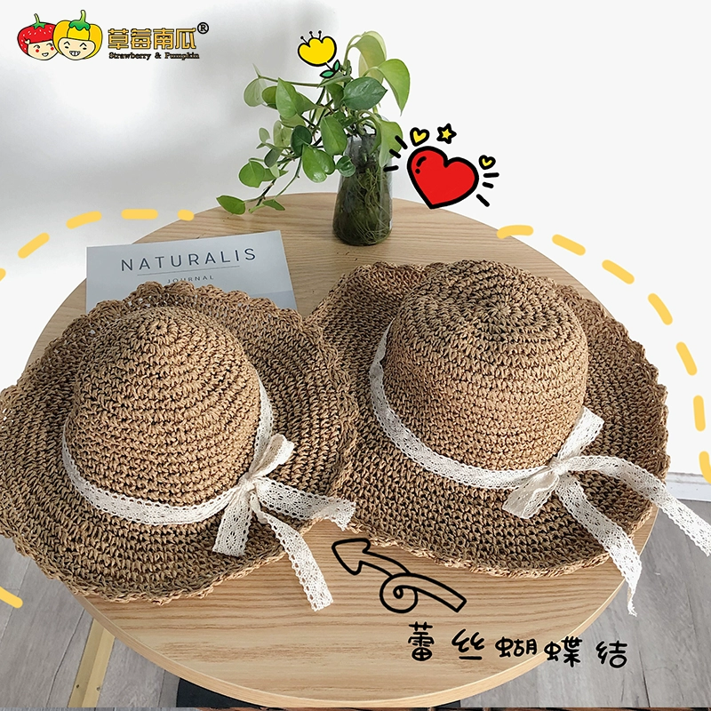 Girls spring and summer sun protection hat summer travel beach hat cute and versatile Korean style lace bow straw hat
