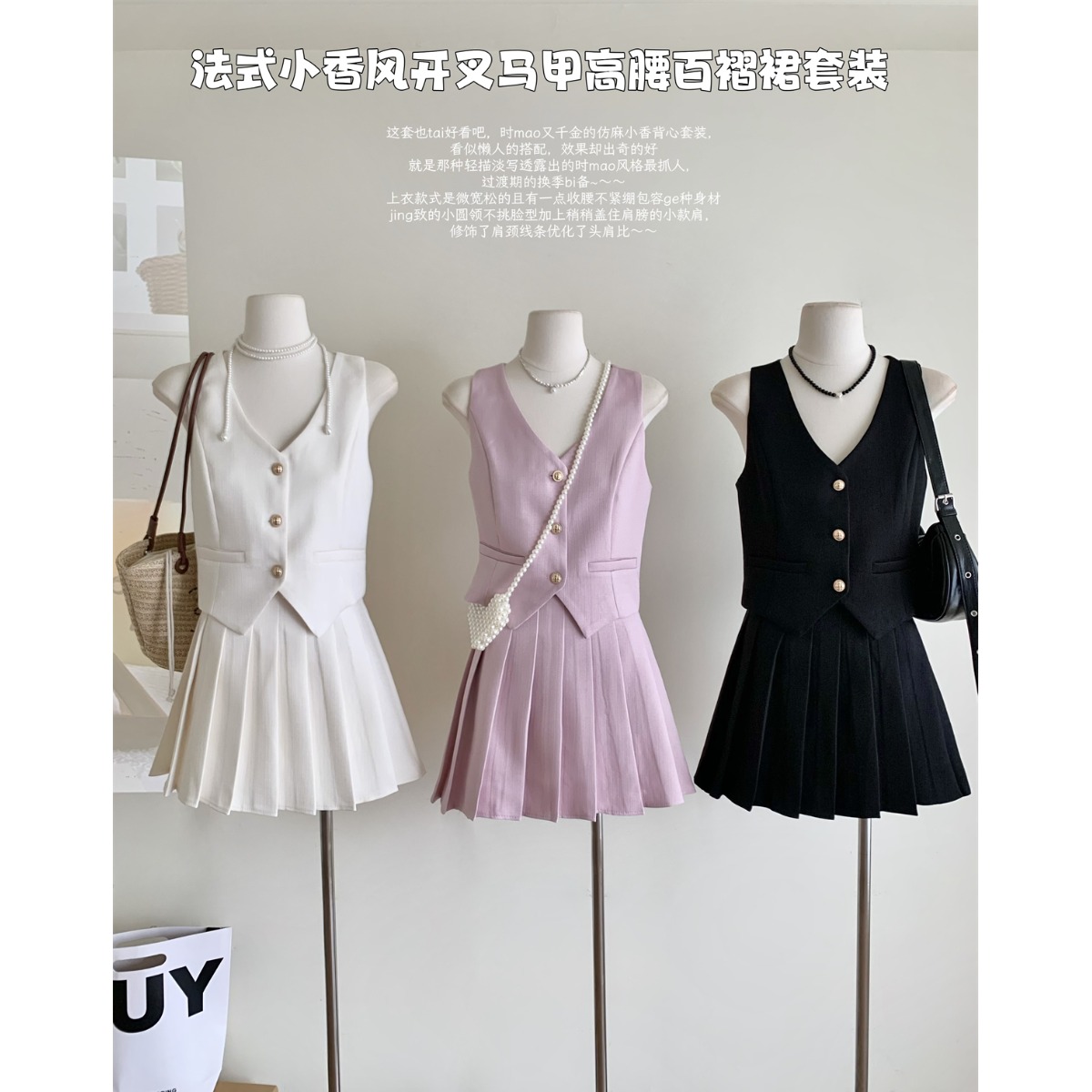 Luxurious, sweet and rich-style two-piece suit for women, single-breasted vest top + pleated skirt