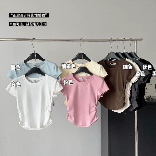 Solid color pleated irregular short-sleeved T-shirt for women 2024 spring new slim waist slimming round neck T-shirt top
