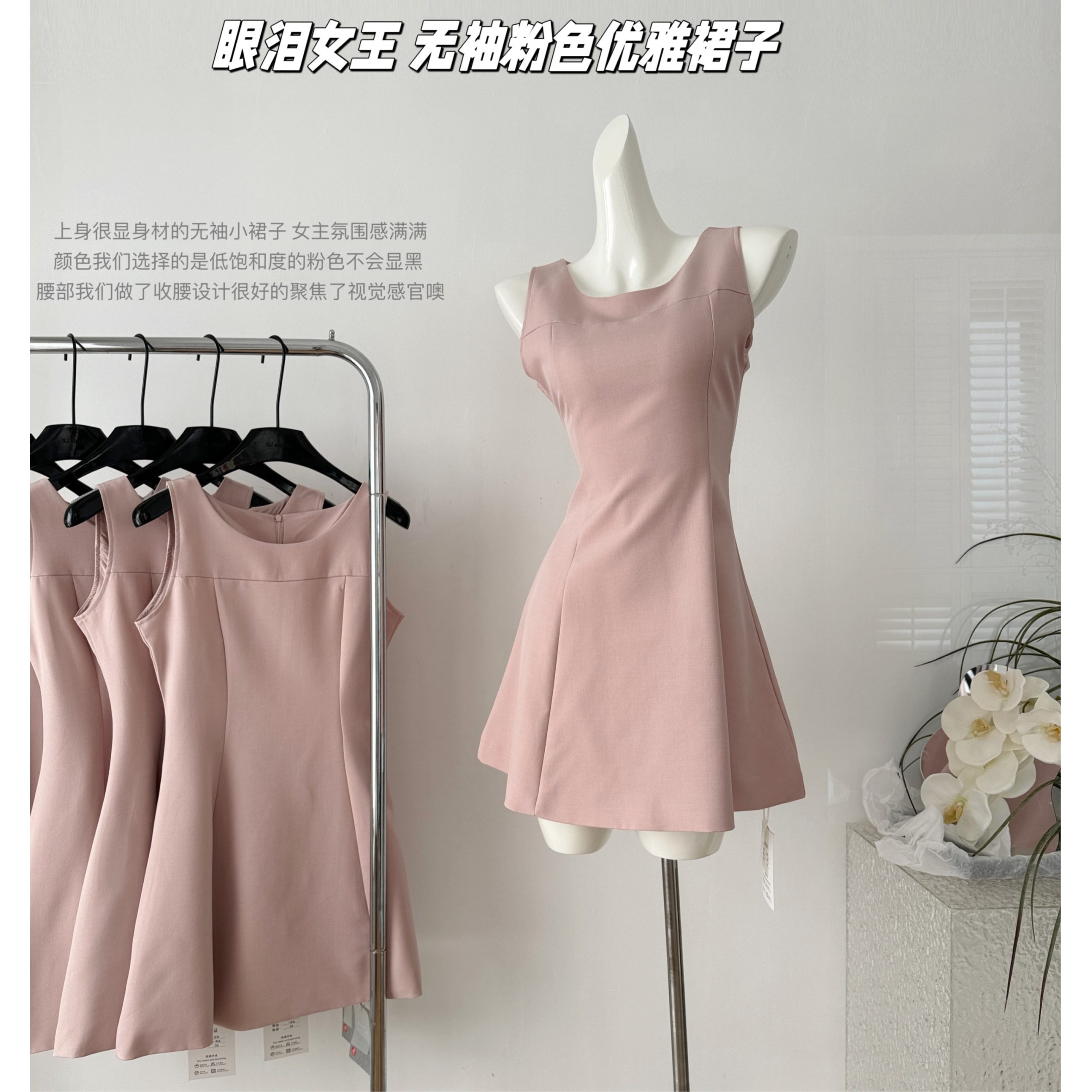 Sleeveless women’s summer waist-cinching high-end pink dress