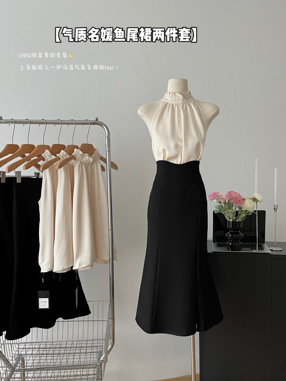 Elegant socialite French sleeveless halterneck satin top skirt fishtail skirt two-piece suit spring chic slim fit