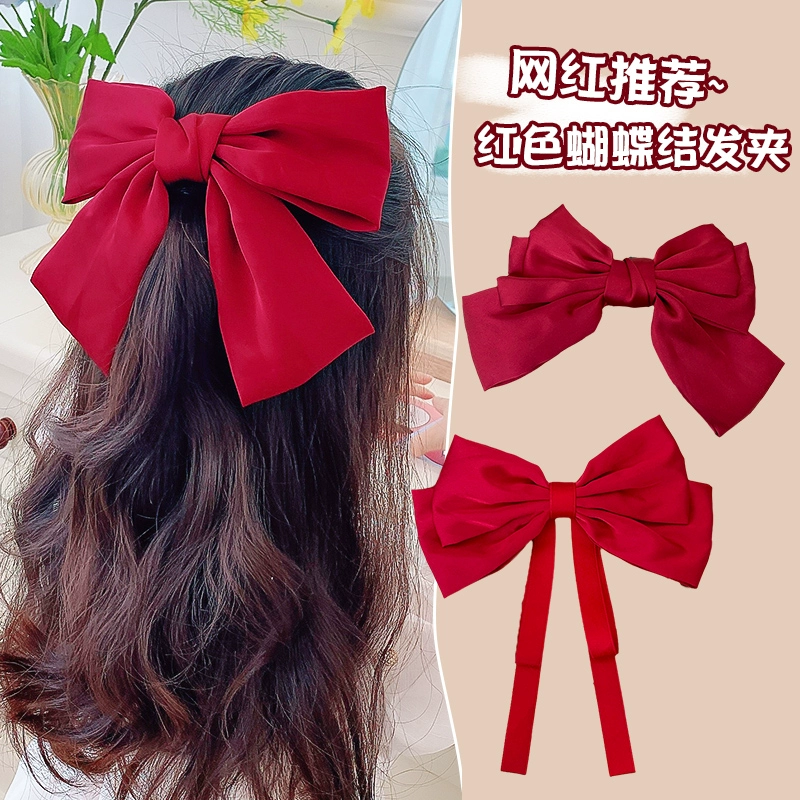 Red bow headband on the back of children’s head, girl’s streamer hairpin, princess high-end spring clip, female hairpin hair accessory