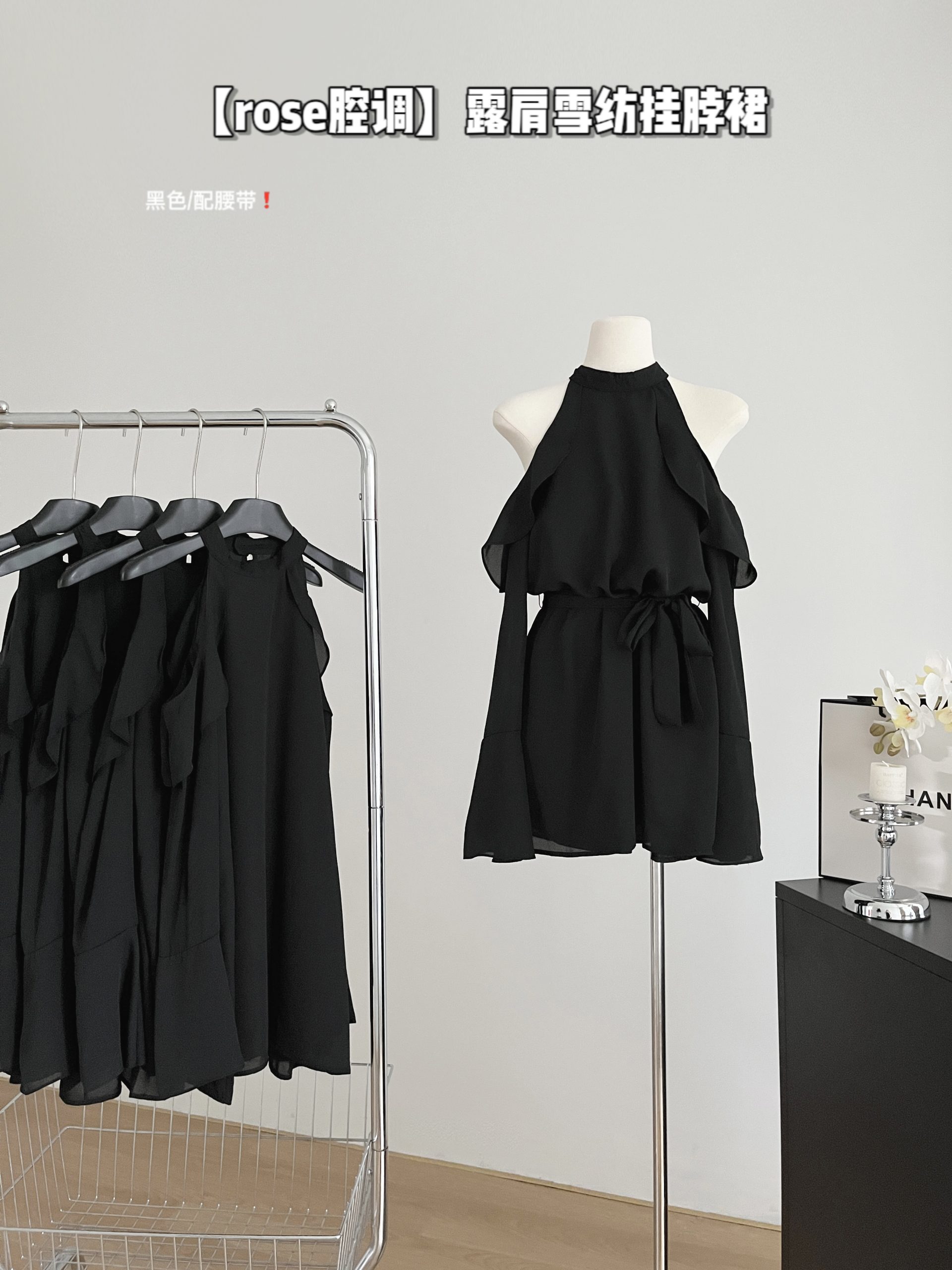 Peach homemade rose accent dress for women summer off-shoulder chiffon French sexy black halterneck dress