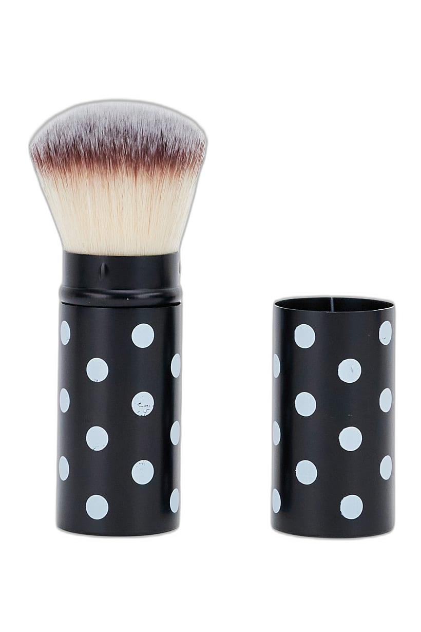 Black and white polka dot powder brush with retractable feature.