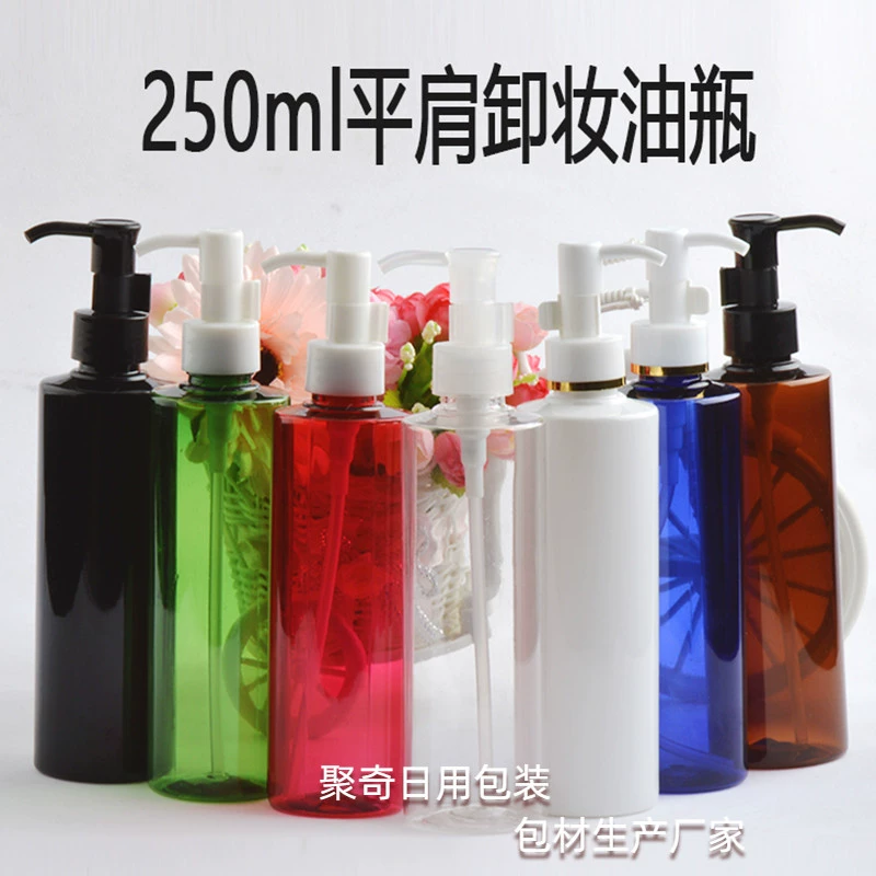 250ml flat shoulder cleansing oil pump bottle black and white brown blue green red transparent lotion bottle PET plastic packaging material