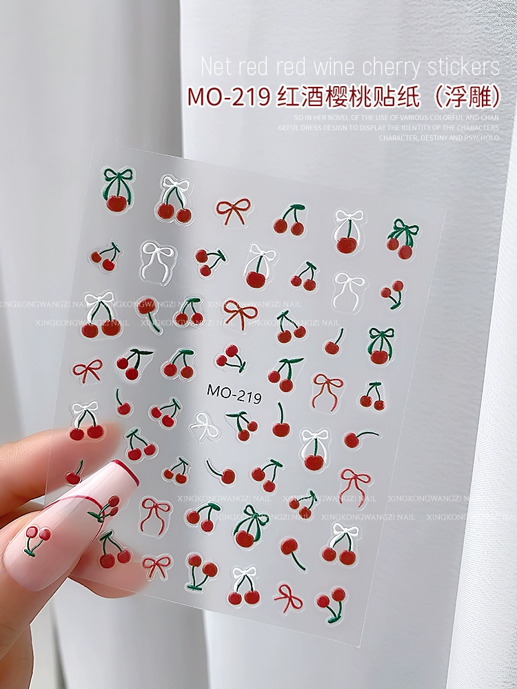Internet celebrity manicure red wine cherry sticker 2024 new butterfly crystal diamond relief three-dimensional nail decal decoration