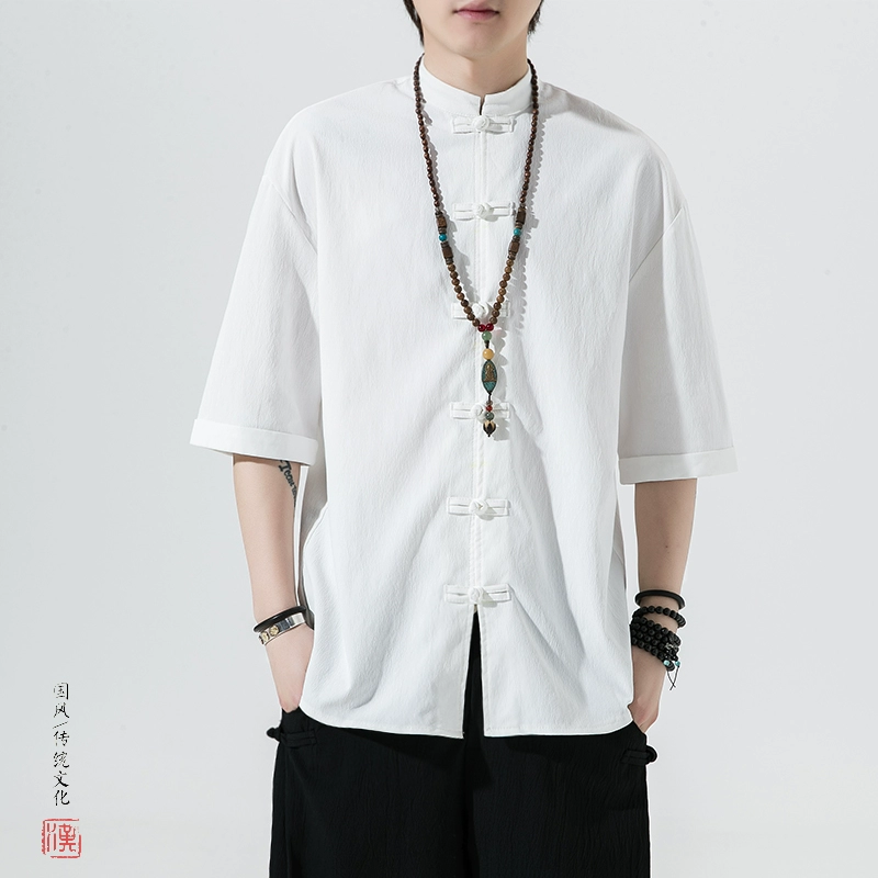 Chinese style short-sleeved ice silk ancient costume cotton and linen Hanfu plate buckle