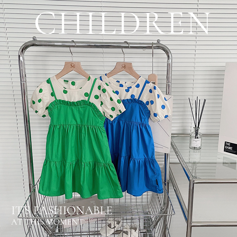 2022 new children’s clothing summer short sleeve dress polka dot fake two bubble sleeve skirt Korean style dress