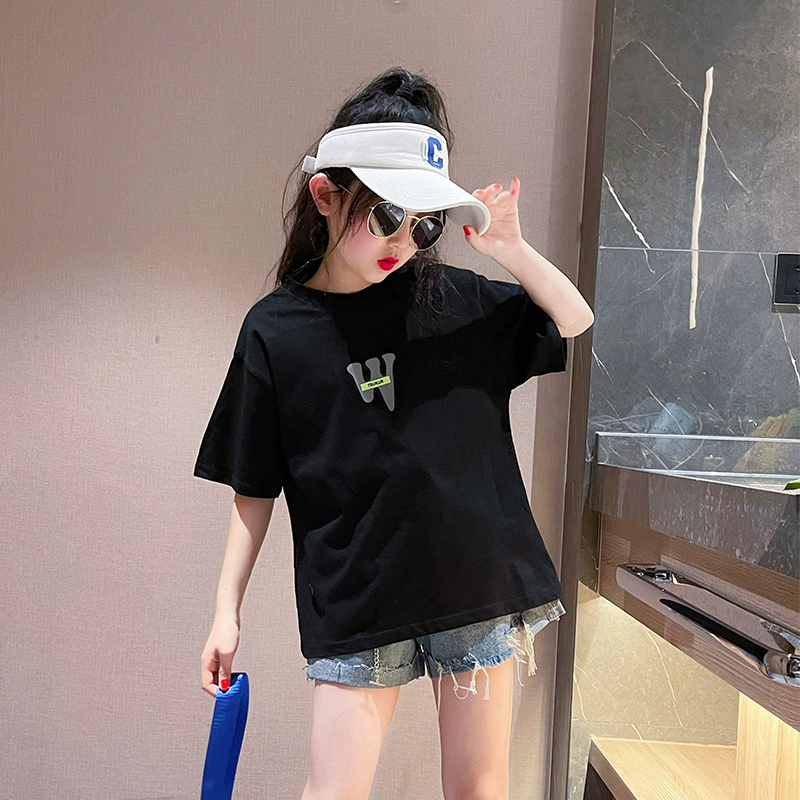 Girls short-sleeved T-shirt suit summer 2024 new style children’s stylish black top summer girl casual T-shirt