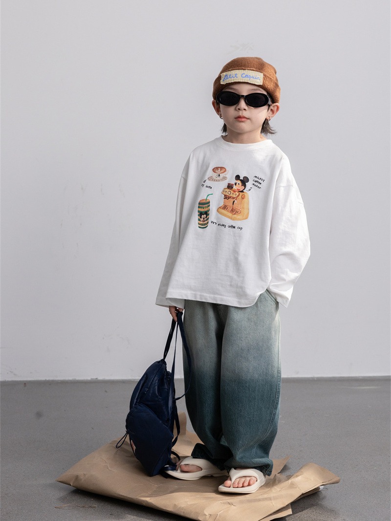 Cheese and meow Korean style 2024 New Spring boys’ printed T-shirt long sleeve children’s loose pullover top fashion