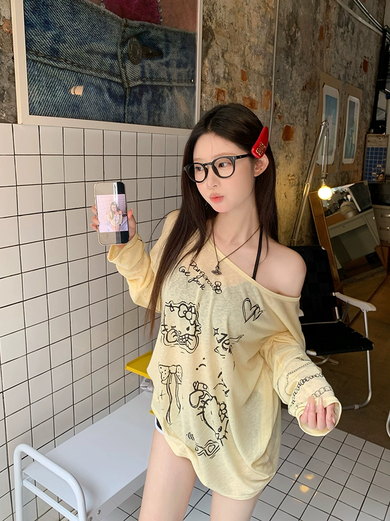Autumn and winter printed long-sleeved T-shirt slim fit thin top mesh