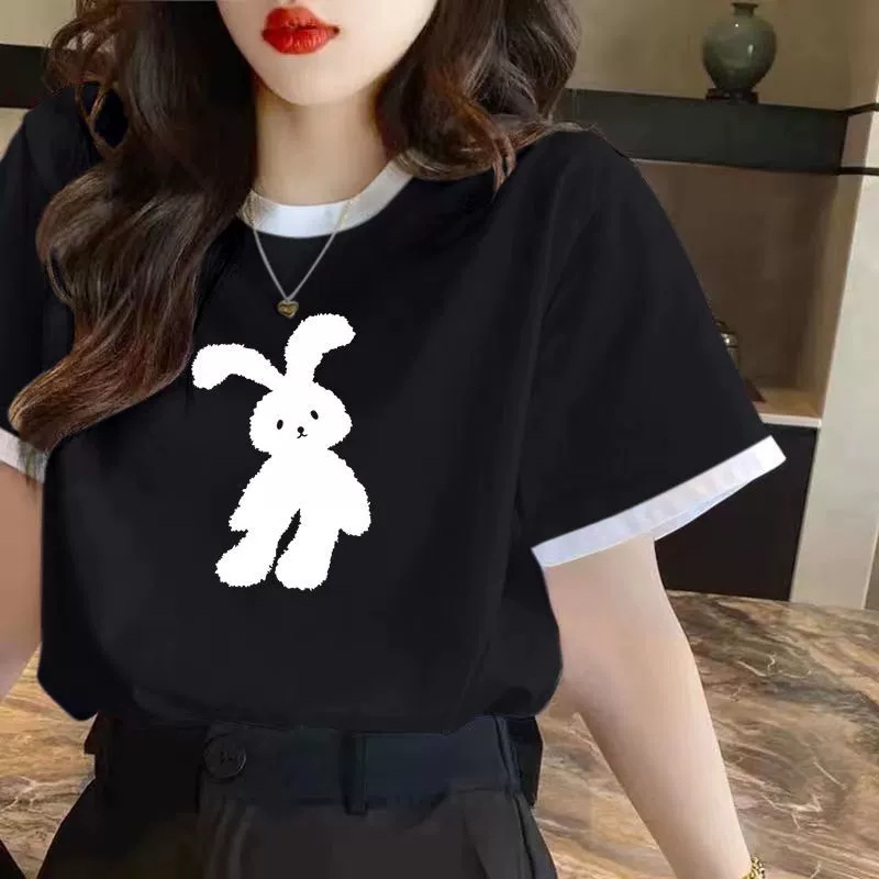 Women’s right shoulder summer pure cotton contrasting short-sleeved T-shirt