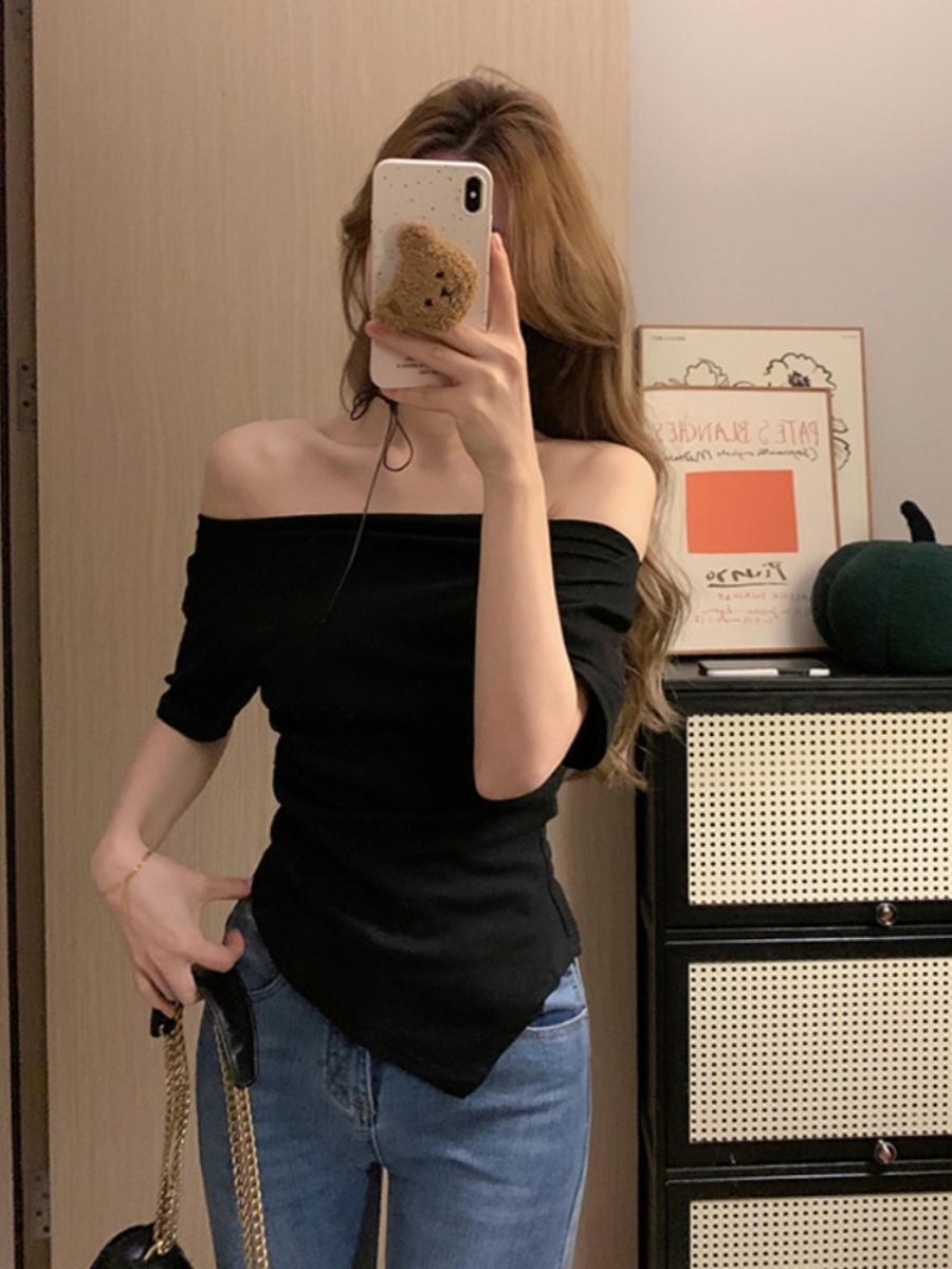 Solid Color Versatile Right Shoulder Summer Round Neck Short Sleeve T-Shirt