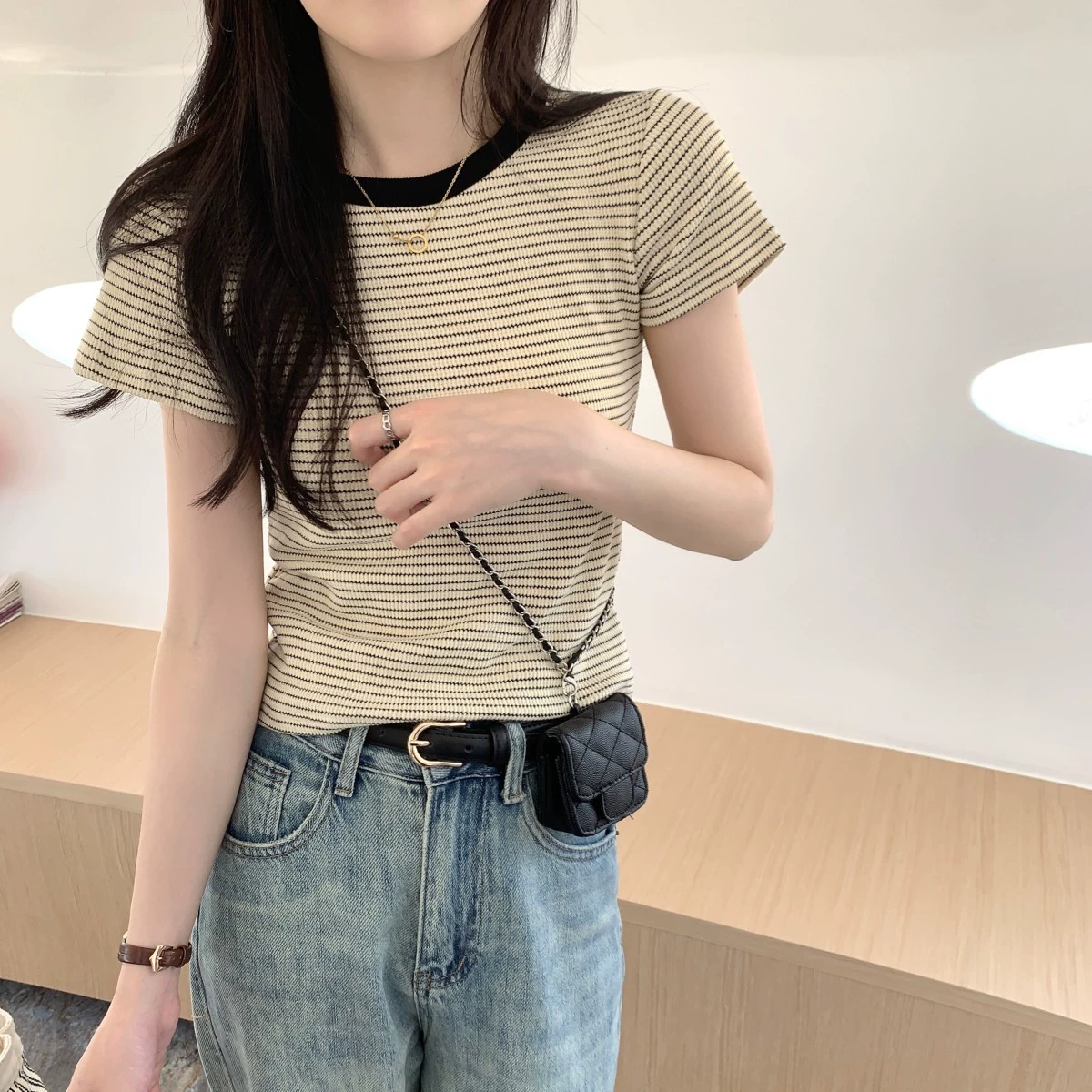 Round neck contrast striped summer slim short-sleeved T-shirt