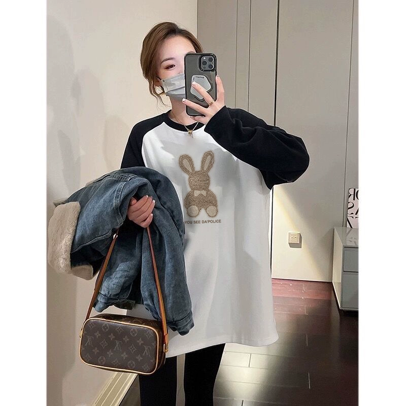 Spring, Autumn and Winter Contrast Color Long Sleeve Loose Butt Covering T-Shirt