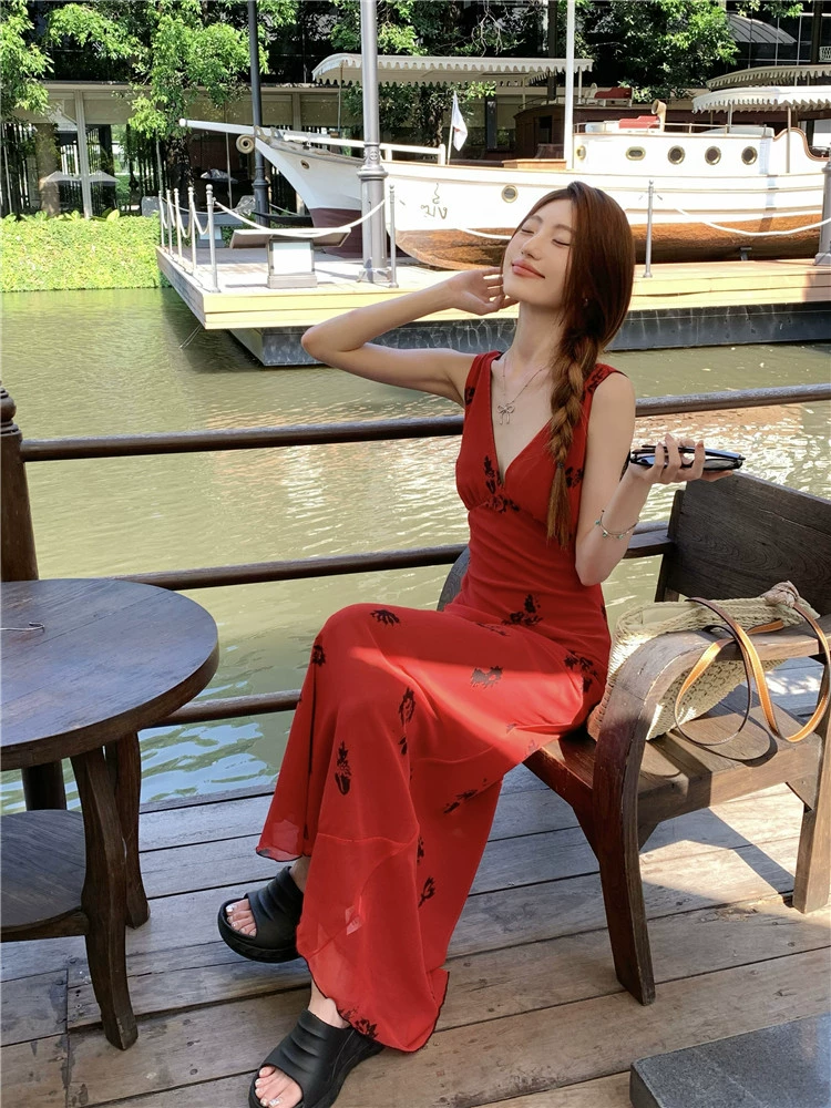 Mid-length holiday sleeveless vest dress 2024 summer women’s retro rose print nail diamond high waist slim dress