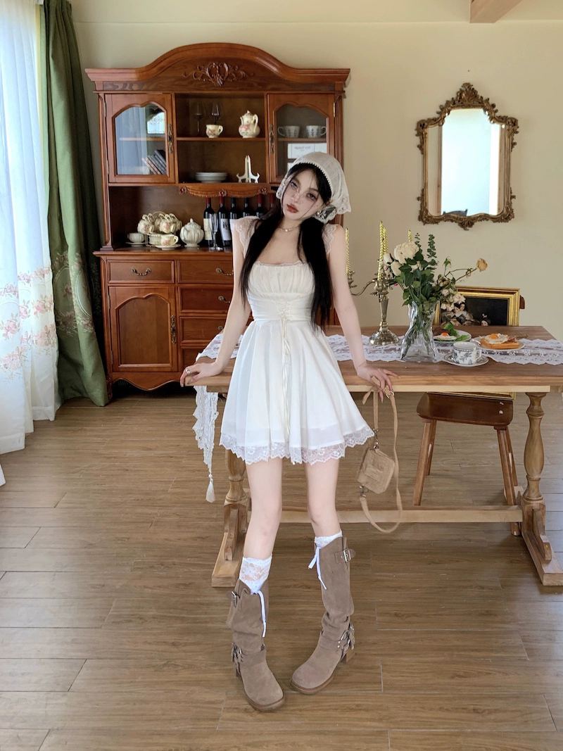 Gentle French summer lace patchwork suspender dress