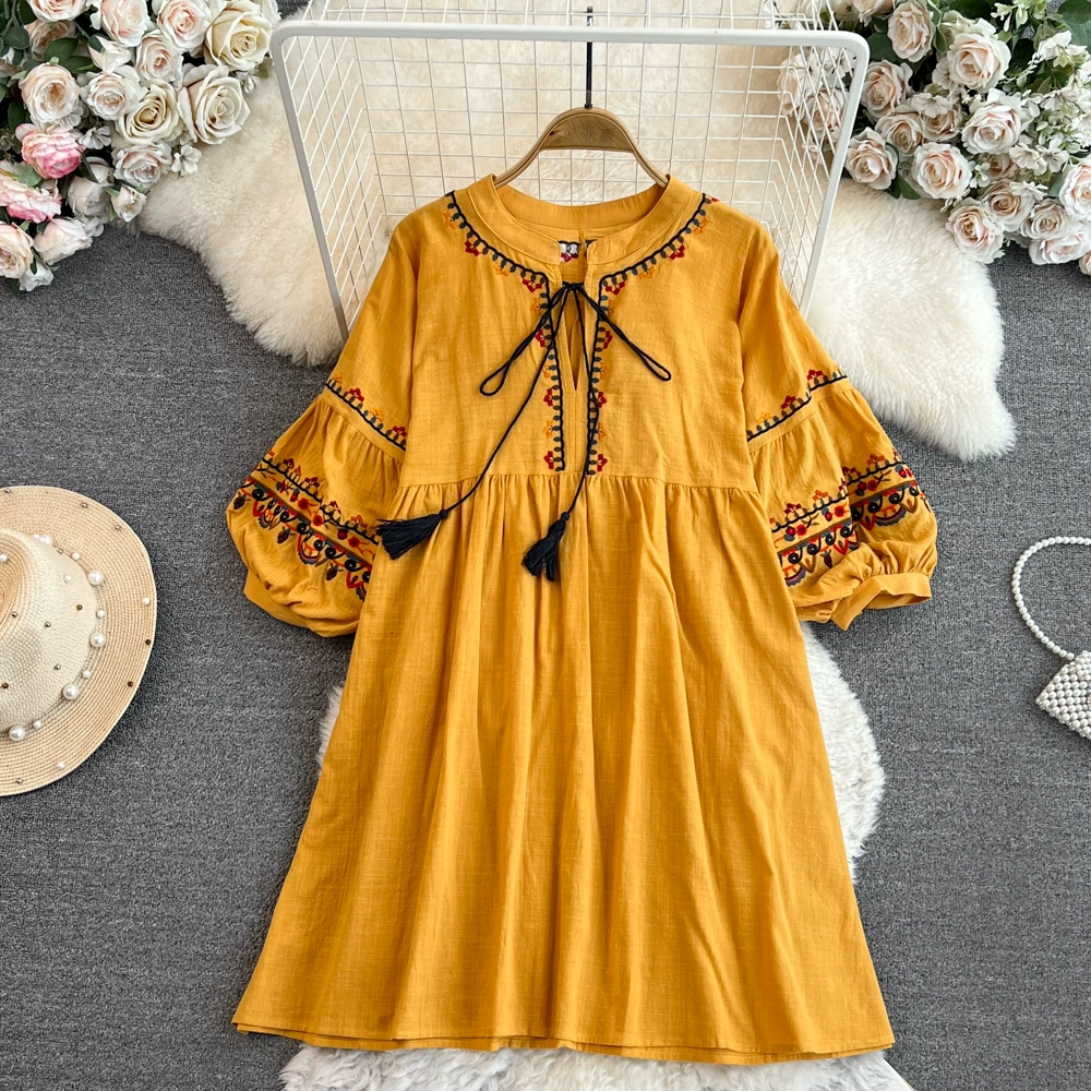 Boho cotton and linen fringed loose dress embroidered