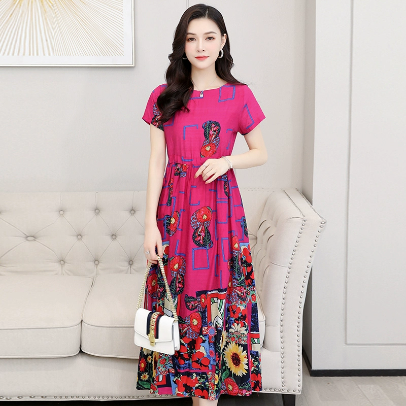 2023 new fashion round neck printed cotton silk dress