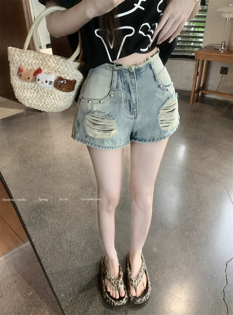 American style ripped straight high waisted a-line denim shorts