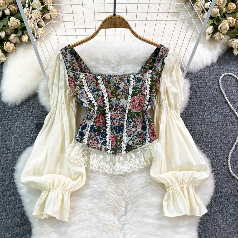 Spring and Autumn Lantern Long Sleeve Square Collar Jacquard Casual Pullover