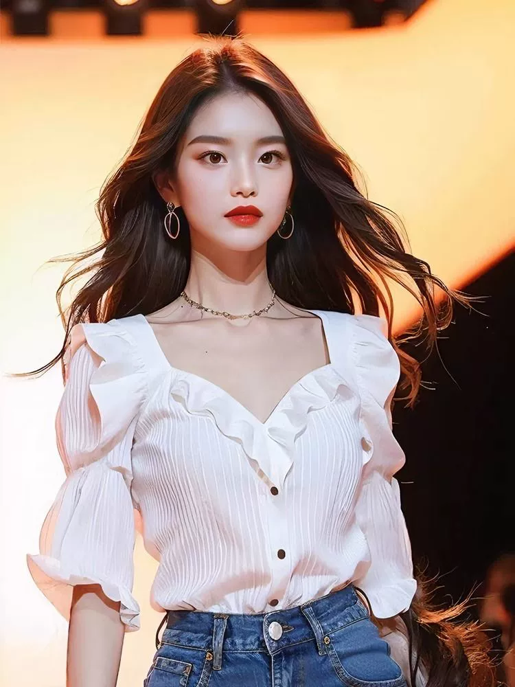 2024 early spring women’s tops, chic, beautiful and beautiful French blouse, white v-neck ruffled right shoulder shirt