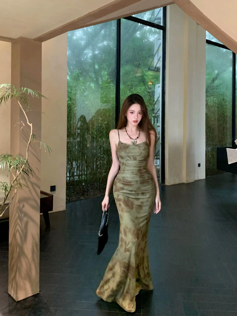 Retro suspender dress summer fishtail flower print