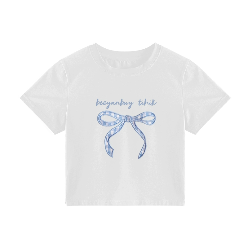 Age-reducing slim fit letter printed round neck short sleeve bow