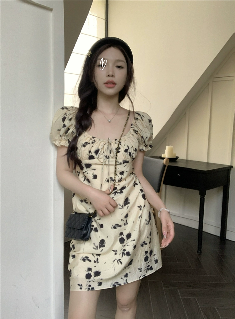 Retro strappy round neck summer breasted floral dress