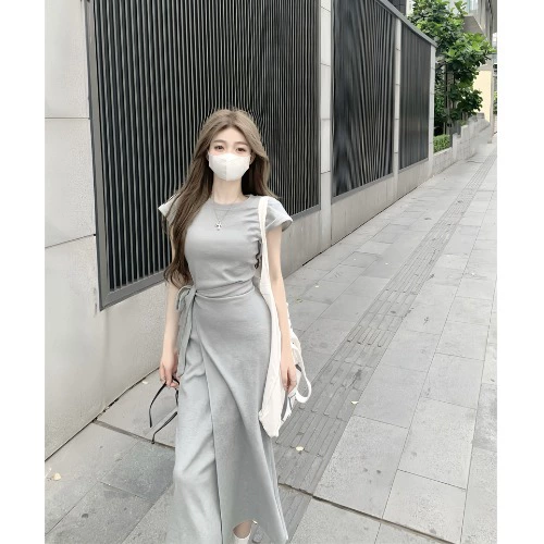 Summer casual a-line bow tie short-sleeved long skirt