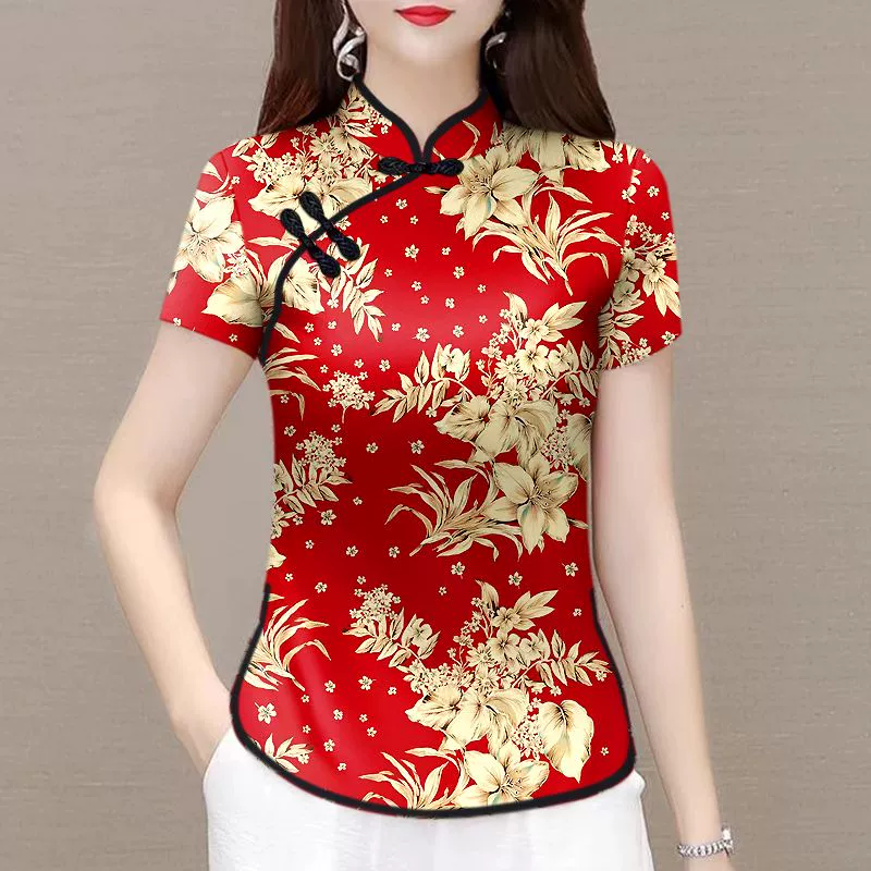 National trend new Chinese style split stand collar short-sleeved top with button