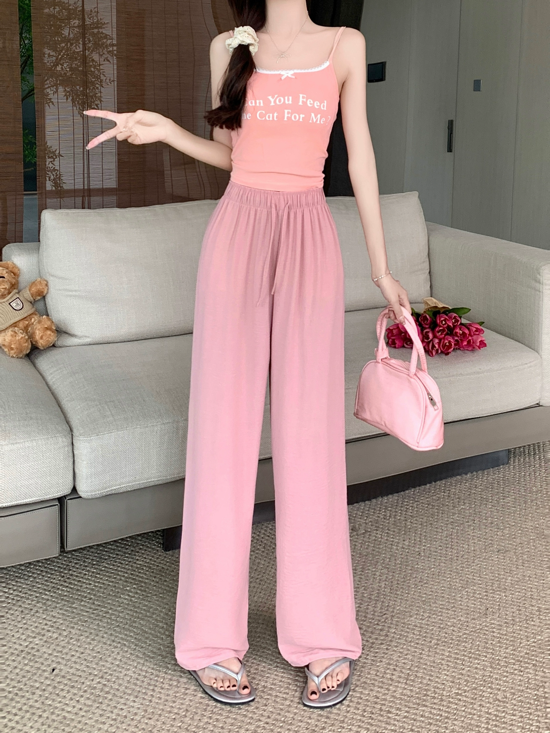 Men’s and women’s tight-fitting drapey wide-leg pants and short T-shirts