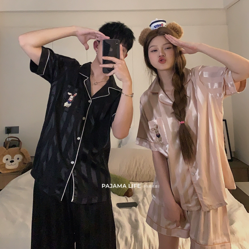 Couple Pajamas Women’s Summer Short-Sleeved Ice Silk Cool Set Thin Imitation Silk Wearable Cartoon Rabbit Home Clothes