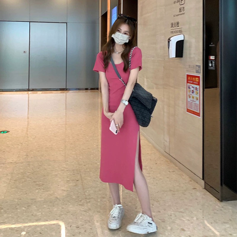 French temperament square neck short-sleeved dress for women in summer slimming slim slit hip-covering T-shirt long skirt
