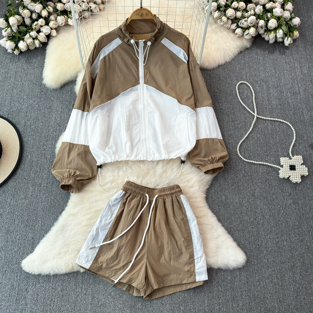 Casual sports color matching suit for women summer seaside vacation sun protection breathable clothes jacket wide leg shorts two piece set