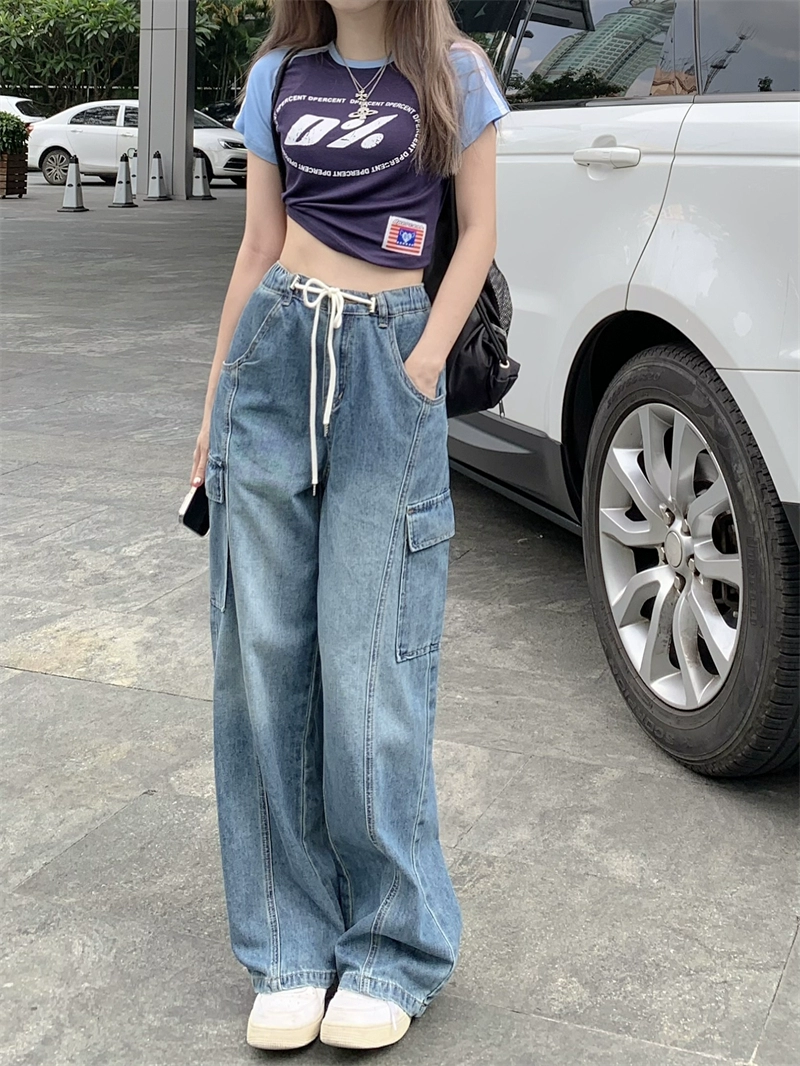 American style spring pocket high waist floor-length trousers with drawstring