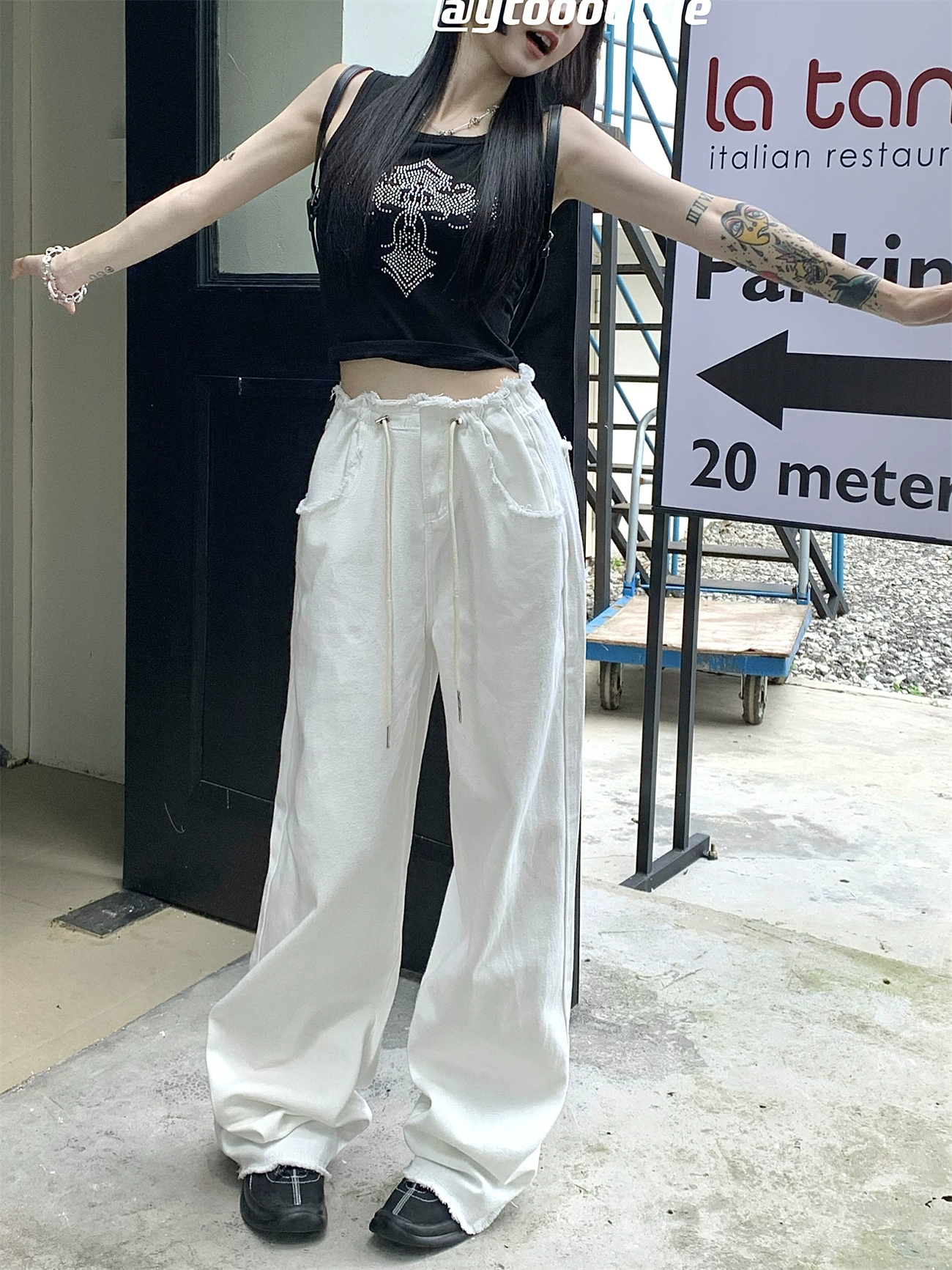 White elastic waist raw edge wide leg straight trousers with drawstring