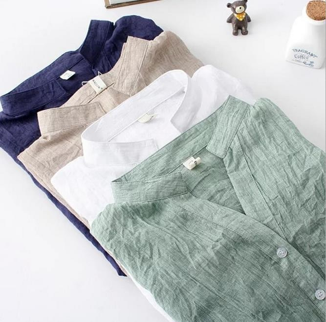 2023 Spring and Summer Sunscreen Clothing Japanese Style Fresh Loose Cotton and Linen Seven-Sleeve Vertical Collar Linen Shirt Women’s Fashion