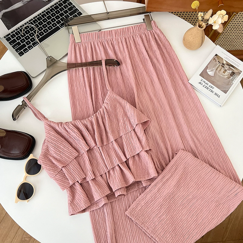 Multi-layer ruffled elastic waist slimming wide-leg pants suspenders