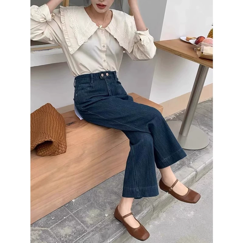 Retro straight leg nine-point pear-shaped figure crotch-covering jeans