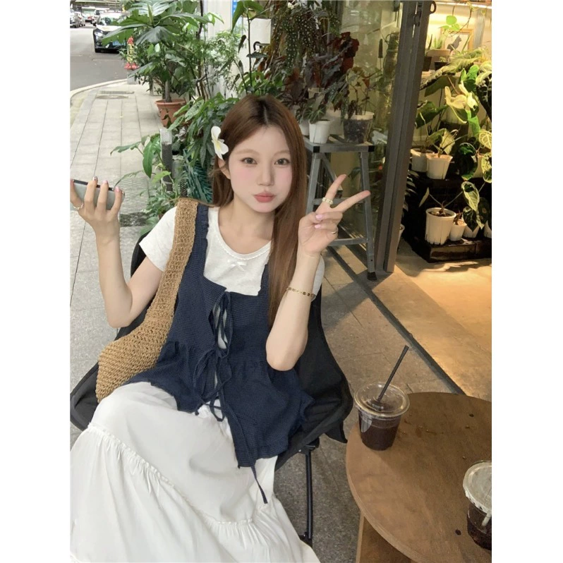 Front and back plaid suspender summer retro bow