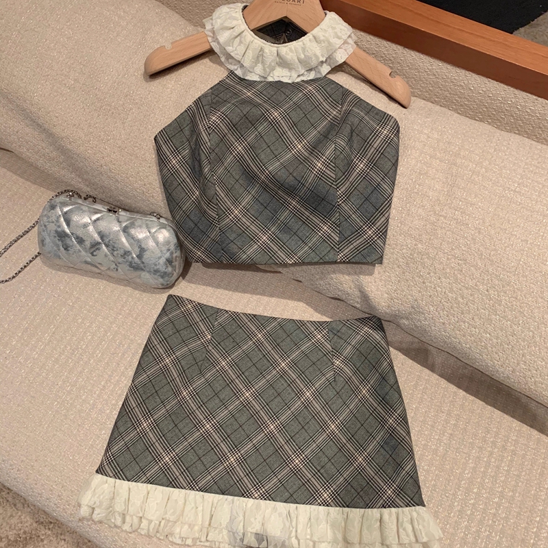 [Japanese Sweetheart] Plaid Lotus Lace Sweet Sleeveless Versatile Top + A-Line Skirt for Women