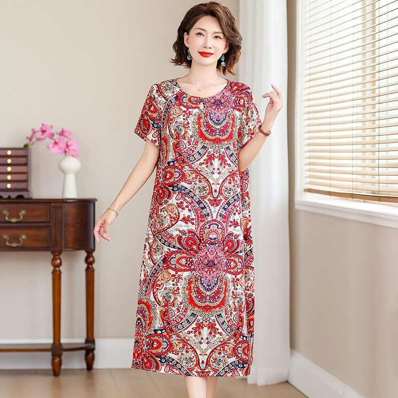 New middle-aged mother’s cotton silk dress women’s summer middle-aged and elderly high-end fashionable and rich lady’s artificial cotton skirt