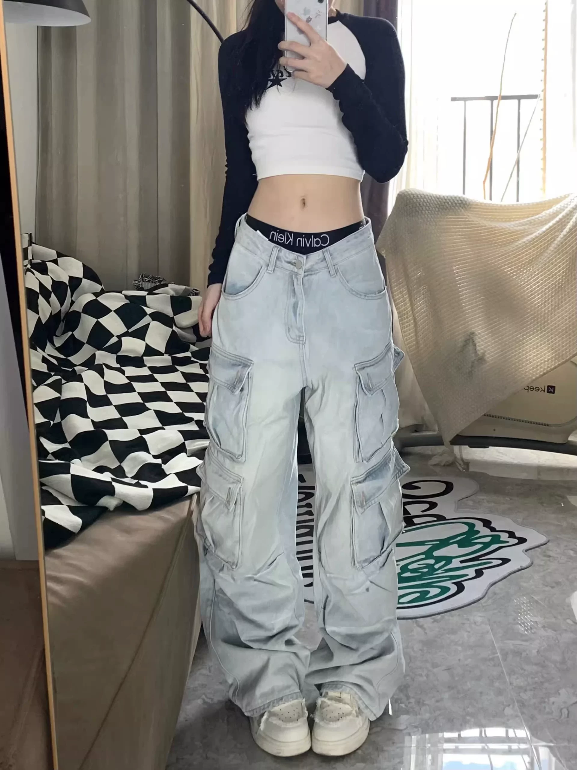 SOOSLU White Paratrooper Pants Women’s Spring and Summer Foot-bound Niche Loose and Versatile Drawstring Casual Wide-Leg Pants Trendy