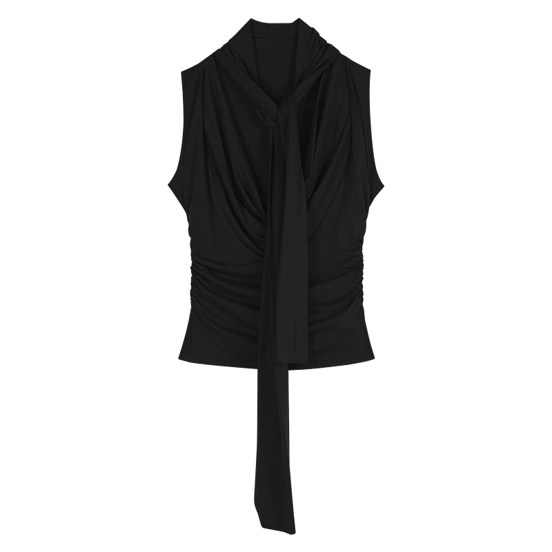 Ribbon Slim Sleeveless Pleated Waist Swing Collar Tank Top