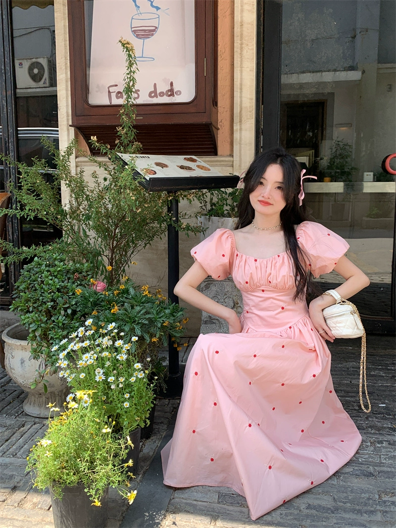 Gentle French square neck summer A-line polka-dot dress