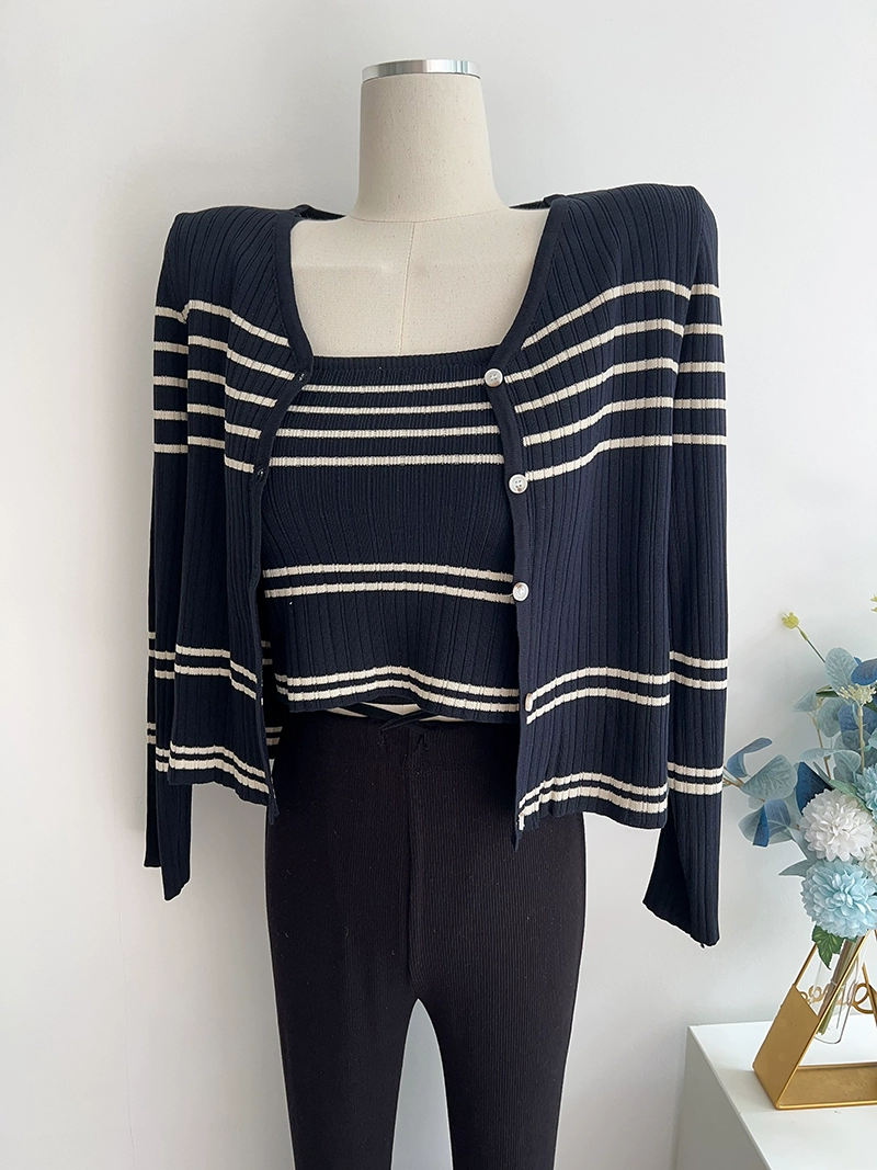 ins black and white striped knitted flat collar suspender jacket