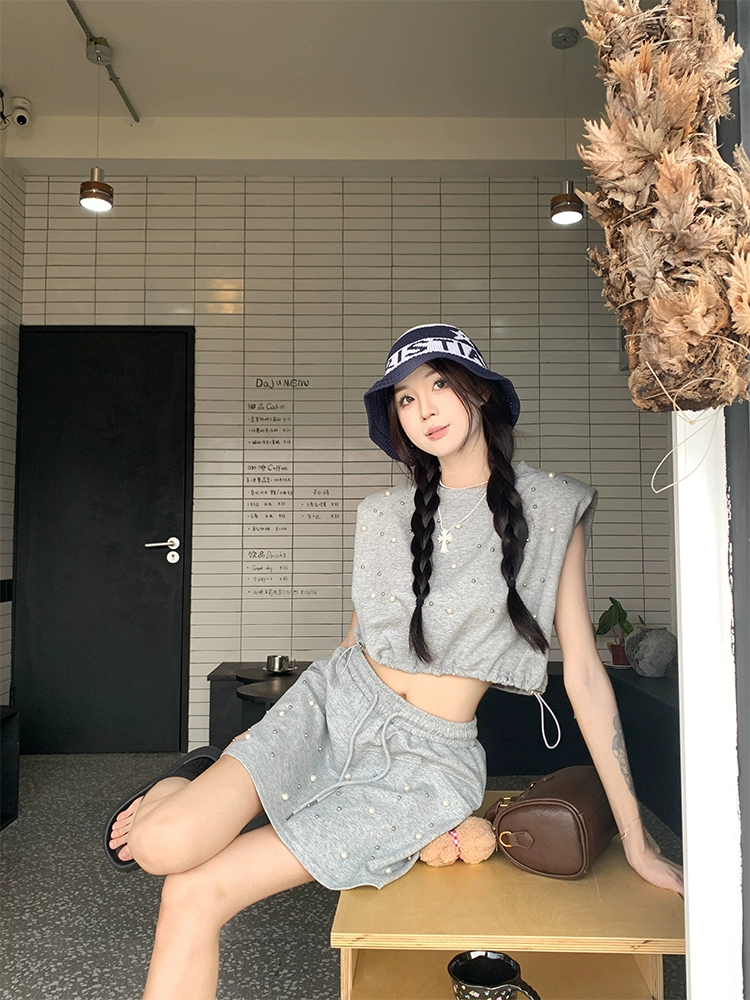 Stylish Sleeveless High Waist Drawstring Two Piece Set Heavy Beading