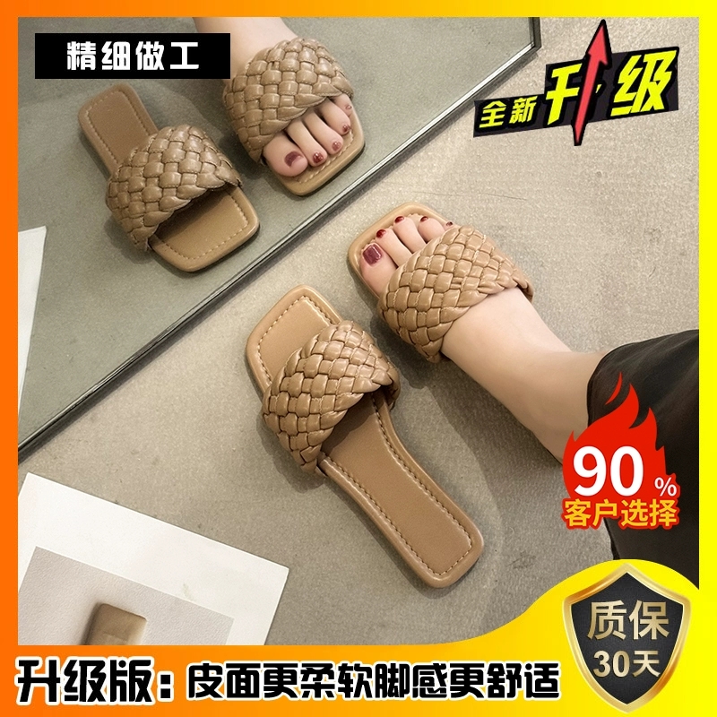 Woven slippers for women’s summer outer wear 2024 new style fashionable and versatile women’s square toe flat holiday beach slippers